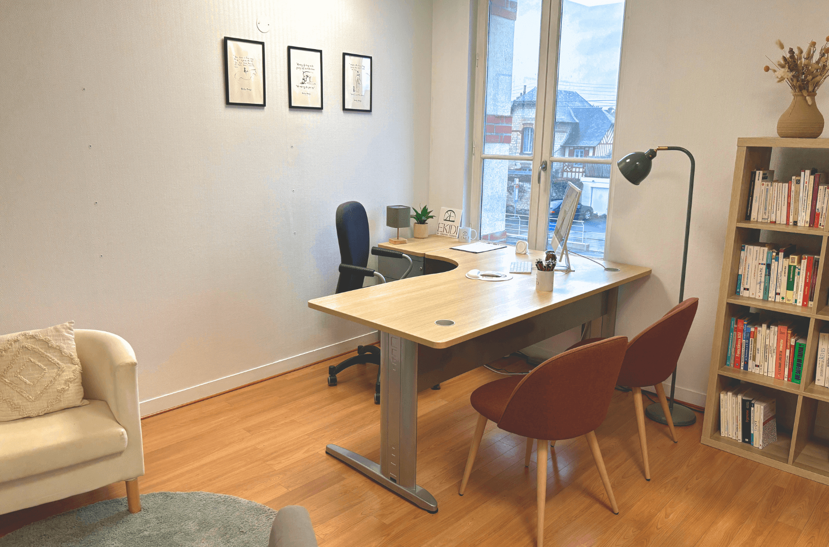 Un espace aménagé avec soin pour assurer un cadre de travail confortable et confidentiel.
